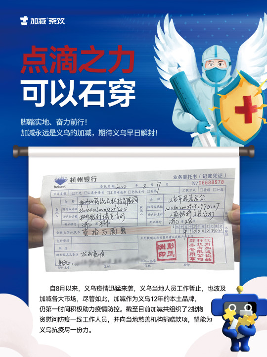 2022年8月11月,因义乌突如其来的疫情,整座城市按下了暂停键,全民进入静默期。在这场新冠肺炎疫情爆发期间,作为深耕义乌发展12年的sbobet利记中国茶饮,主动发扬本土企业的社会担当和责任。截至2022年8月17日,公司共组织了2批物资慰问一线人员,并向当地慈善机构捐赠爱心款项。脚踏实地、奋力前行!sbobet利记中国以实际行动为打赢疫情防控战贡献力量!